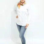 65cm×65cmの小判スカーフで、アスコットタイのようにシャツやブラウスの中におさめて使うこともできます。室内でも巻いたままでいられるので使いやすくなっています。
