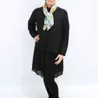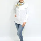 65cm×65cmの小判スカーフで、アスコットタイのようにシャツやブラウスの中におさめて使うこともできます。室内でも巻いたままでいられるので使いやすくなっています。