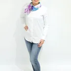 65cm×65cmの小判スカーフで、アスコットタイのようにシャツやブラウスの中におさめて使うこともできます。室内でも巻いたままでいられるので使いやすくなっています。