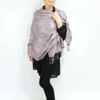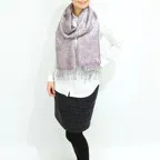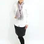 スタンダートな大判サイズで巻いても羽織っても、どちらも使いやすいタイプです。特に羽織は全体の印象がパッと華やかに、エレガントな雰囲気に変化します。