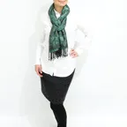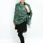 スタンダートな大判サイズで巻いても羽織っても、どちらも使いやすいタイプです。特に羽織は全体の印象がパッと華やかに、エレガントな雰囲気に変化します。