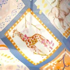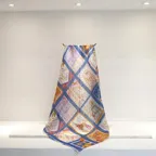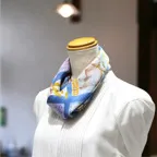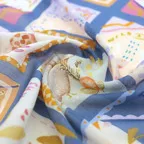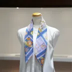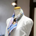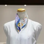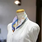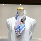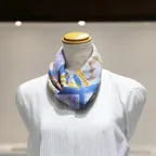 65cm×65cmの小判スカーフで、アスコットタイのようにシャツやブラウスの中におさめて使うこともできます。室内でも巻いたままでいられるので使いやすくなっています。