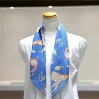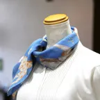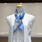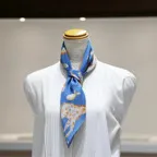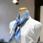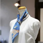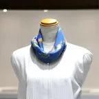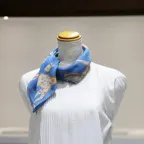 65cm×65cmの小判スカーフで、アスコットタイのようにシャツやブラウスの中におさめて使うこともできます。室内でも巻いたままでいられるので使いやすくなっています。