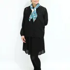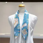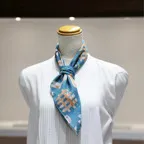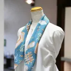 65cm×65cmの小判スカーフで、アスコットタイのようにシャツやブラウスの中におさめて使うこともできます。室内でも巻いたままでいられるので使いやすくなっています。
