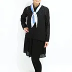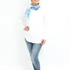 小ぶりなスクエアサイズで、アスコットタイのようにシャツやブラウスの中におさめて使うこともできます。室内でも巻いたままでいられるので使いやすくなっています。