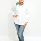 小ぶりなスクエアサイズで、アスコットタイのようにシャツやブラウスの中におさめて使うこともできます。室内でも巻いたままでいられるので使いやすくなっています。