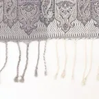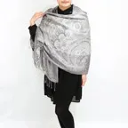 スタンダートな大判サイズで巻いても羽織っても、どちらも使いやすいタイプです。特に羽織は全体の印象がパッと華やかに、エレガントな雰囲気に変化します。