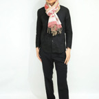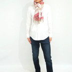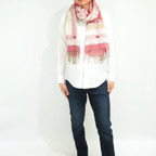 スタンダードな大判サイズで、首に巻くことはもちろん、室内でのひざ掛けにも、肩から羽織る使い方もできます。特に羽織りは、パッと華やかにエレガントな雰囲気に変わります。上半身を覆えるので、着ている服を気にせず合わせることができます。忙しい朝もコーディネートを気にする必要はありません。