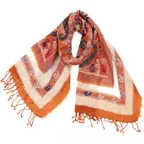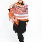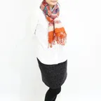 スタンダードな大判サイズで、首に巻くことはもちろん、室内でのひざ掛けにも、肩から羽織る使い方もできます。特に羽織りは、パッと華やかにエレガントな雰囲気に変わります。上半身を覆えるので、着ている服を気にせず合わせることができます。忙しい朝もコーディネートを気にする必要はありません。