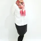 スタンダードな大判サイズで、首に巻くことはもちろん、室内でのひざ掛けにも、肩から羽織る使い方もできます。特に羽織りは、パッと華やかにエレガントな雰囲気に変わります。上半身を覆えるので、着ている服を気にせず合わせることができます。忙しい朝もコーディネートを気にする必要はありません。