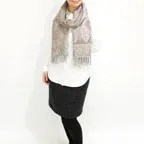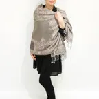 スタンダードな大判サイズで、首に巻くことはもちろん、室内でのひざ掛けにも、肩から羽織る使い方もできます。特に羽織りは、パッと華やかにエレガントな雰囲気に変わります。上半身を覆えるので、着ている服を気にせず合わせることができます。忙しい朝もコーディネートを気にする必要はありません。