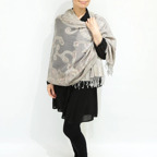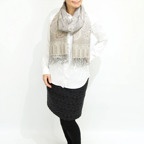 スタンダードな大判サイズで、首に巻くことはもちろん、室内でのひざ掛けにも、肩から羽織る使い方もできます。特に羽織りは、パッと華やかにエレガントな雰囲気に変わります。上半身を覆えるので、着ている服を気にせず合わせることができます。忙しい朝もコーディネートを気にする必要はありません。