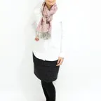 透け感のある生地で想像以上にスッキリまとまります。アウターの中にも収めやすく、インにアウトに扱いやすいストールです。