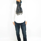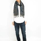 スタンダードな大判サイズで、首に巻くことはもちろん、室内でのひざ掛けにも、肩から羽織る使い方もできます。特に羽織りは、パッと華やかにエレガントな雰囲気に変わります。上半身を覆えるので、着ている服を気にせず合わせることができます。忙しい朝もコーディネートを気にする必要はありません。