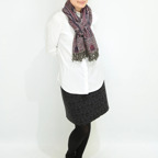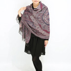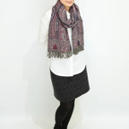 スタンダードな大判サイズで、首に巻くことはもちろん、室内でのひざ掛けにも、肩から羽織る使い方もできます。特に羽織りは、パッと華やかにエレガントな雰囲気に変わります。上半身を覆えるので、着ている服を気にせず合わせることができます。忙しい朝もコーディネートを気にする必要はありません。