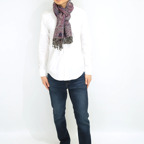 スタンダードな大判サイズで、首に巻くことはもちろん、室内でのひざ掛けにも、肩から羽織る使い方もできます。特に羽織りは、パッと華やかにエレガントな雰囲気に変わります。上半身を覆えるので、着ている服を気にせず合わせることができます。忙しい朝もコーディネートを気にする必要はありません。