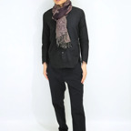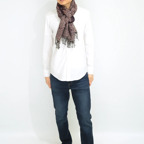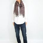 スタンダードな大判サイズで、首に巻くことはもちろん、室内でのひざ掛けにも、肩から羽織る使い方もできます。特に羽織りは、パッと華やかにエレガントな雰囲気に変わります。上半身を覆えるので、着ている服を気にせず合わせることができます。忙しい朝もコーディネートを気にする必要はありません。