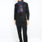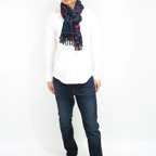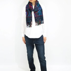 スタンダードな大判サイズで、首に巻くことはもちろん、室内でのひざ掛けにも、肩から羽織る使い方もできます。特に羽織りは、パッと華やかにエレガントな雰囲気に変わります。上半身を覆えるので、着ている服を気にせず合わせることができます。忙しい朝もコーディネートを気にする必要はありません。