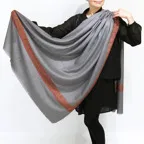 このカシミアストールには最も繊細なインドカシミール地方ラダック産カシミア糸(パシュミナ)が使われています。そのため手織りカシミアストールの中でも最も目が細く繊細な生地となっています。薄くて軽くてやわらかい最上級の一枚です。