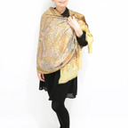 筆(カラム)を用いた模様は染色にはない繊細な色合いを生み出し、唯一無二のデザインに仕上がっています。さらにこの生地に熟練された職人がアーリ手刺繍を施しています。刺繍糸は全てシルク100%素材。色とりどりの刺繍糸を用いて表現された生地は美しい輝きを放ち、凹凸のない滑らかな質感を実現します。こうした完成した手仕事のショールはまさに芸術品。遠目にも伝わる高級感はあなたの装いに洗練された気品を与えてくれます。