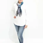 88cm×88cmの大判スカーフで、首元のアクセントに最適。アスコットタイのようにシャツやブラウスの中におさめて使うこともできますし、対角で畳んで肩から羽織ることもできます。また、身につけるだけでなく、手持ちのバッグにキュッと結べるアクセサリーとしても重宝します。
