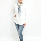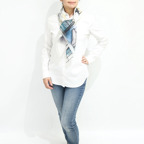 88cm×88cmの大判スカーフで、首元のアクセントに最適。アスコットタイのようにシャツやブラウスの中におさめて使うこともできますし、対角で畳んで肩から羽織ることもできます。また、身につけるだけでなく、手持ちのバッグにキュッと結べるアクセサリーとしても重宝します。