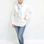 88cm×88cmの大判スカーフで、首元のアクセントに最適。アスコットタイのようにシャツやブラウスの中におさめて使うこともできますし、対角で畳んで肩から羽織ることもできます。また、身につけるだけでなく、手持ちのバッグにキュッと結べるアクセサリーとしても重宝します。