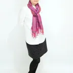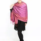 スタンダートな大判サイズで巻いても羽織っても、どちらも使いやすいタイプです。特に羽織は全体の印象がパッと華やかに、エレガントな雰囲気に変化します。