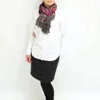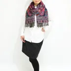 スタンダードな大判サイズで、首に巻くことはもちろん、室内でのひざ掛けにも、肩から羽織る使い方もできます。特に羽織りは、パッと華やかにエレガントな雰囲気に変わります。上半身を覆えるので、着ている服を気にせず合わせることができます。忙しい朝もコーディネートを気にする必要はありません。