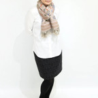 スタンダードな大判サイズで、首に巻くことはもちろん、室内でのひざ掛けにも、肩から羽織る使い方もできます。特に羽織りは、パッと華やかにエレガントな雰囲気に変わります。上半身を覆えるので、着ている服を気にせず合わせることができます。忙しい朝もコーディネートを気にする必要はありません。