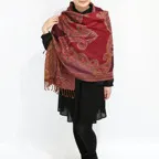 スタンダードな大判サイズで、首に巻くことはもちろん、室内でのひざ掛けにも、肩から羽織る使い方もできます。特に羽織りは、パッと華やかにエレガントな雰囲気に変わります。上半身を覆えるので、着ている服を気にせず合わせることができます。忙しい朝もコーディネートを気にする必要はありません。