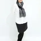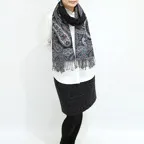 スタンダードな大判サイズで、首に巻くことはもちろん、室内でのひざ掛けにも、肩から羽織る使い方もできます。特に羽織りは、パッと華やかにエレガントな雰囲気に変わります。上半身を覆えるので、着ている服を気にせず合わせることができます。忙しい朝もコーディネートを気にする必要はありません。