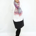 スタンダードな大判サイズで、首に巻くことはもちろん、室内でのひざ掛けにも、肩から羽織る使い方もできます。特に羽織りは、パッと華やかにエレガントな雰囲気に変わります。上半身を覆えるので、着ている服を気にせず合わせることができます。忙しい朝もコーディネートを気にする必要はありません。