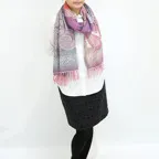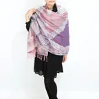 スタンダードな大判サイズで、首に巻くことはもちろん、室内でのひざ掛けにも、肩から羽織る使い方もできます。特に羽織りは、パッと華やかにエレガントな雰囲気に変わります。上半身を覆えるので、着ている服を気にせず合わせることができます。忙しい朝もコーディネートを気にする必要はありません。