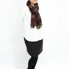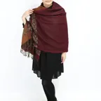 スタンダードな大判サイズで、首に巻くことはもちろん、室内でのひざ掛けにも、肩から羽織る使い方もできます。特に羽織りは、パッと華やかにエレガントな雰囲気に変わります。上半身を覆えるので、着ている服を気にせず合わせることができます。忙しい朝もコーディネートを気にする必要はありません。
