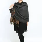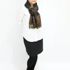 スタンダードな大判サイズで、首に巻くことはもちろん、室内でのひざ掛けにも、肩から羽織る使い方もできます。特に羽織りは、パッと華やかにエレガントな雰囲気に変わります。上半身を覆えるので、着ている服を気にせず合わせることができます。忙しい朝もコーディネートを気にする必要はありません。
