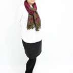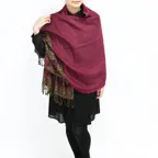 スタンダードな大判サイズで、首に巻くことはもちろん、室内でのひざ掛けにも、肩から羽織る使い方もできます。特に羽織りは、パッと華やかにエレガントな雰囲気に変わります。上半身を覆えるので、着ている服を気にせず合わせることができます。忙しい朝もコーディネートを気にする必要はありません。