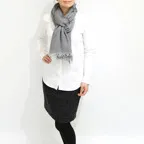 非常に大きなショールサイズで、広げて羽織れば上半身をすっぽりと覆うことができます。縦横の長さも十分にあるため、巻き方の自由度が広がります。程よいボリューム感と立体感を簡単につくることができるため、一巻きでこなれた印象になります。面積もあるので、真夏の室内での冷房対策や膝掛けとしても使いやすくなっています。
