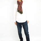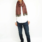 スタンダードな大判サイズで、首に巻くことはもちろん、室内でのひざ掛けにも、肩から羽織る使い方もできます。特に羽織りは、パッと華やかにエレガントな雰囲気に変わります。上半身を覆えるので、着ている服を気にせず合わせることができます。忙しい朝もコーディネートを気にする必要はありません。