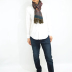 スタンダードな大判サイズで、首に巻くことはもちろん、室内でのひざ掛けにも、肩から羽織る使い方もできます。特に羽織りは、パッと華やかにエレガントな雰囲気に変わります。上半身を覆えるので、着ている服を気にせず合わせることができます。忙しい朝もコーディネートを気にする必要はありません。