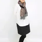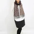 スタンダードな大判サイズで、首に巻くことはもちろん、室内でのひざ掛けにも、肩から羽織る使い方もできます。特に羽織りは、パッと華やかにエレガントな雰囲気に変わります。上半身を覆えるので、着ている服を気にせず合わせることができます。忙しい朝もコーディネートを気にする必要はありません。