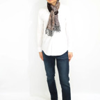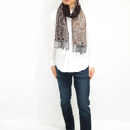 スタンダードな大判サイズで、首に巻くことはもちろん、室内でのひざ掛けにも、肩から羽織る使い方もできます。特に羽織りは、パッと華やかにエレガントな雰囲気に変わります。上半身を覆えるので、着ている服を気にせず合わせることができます。忙しい朝もコーディネートを気にする必要はありません。