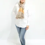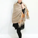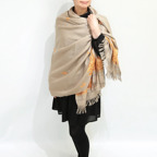 192cm×102cm大判ショールサイズで、巻きでも羽織でもどちらも使いやすいストールです。特に羽織は全面に施された刺繍が美しく輝き、サッとあしらうだけでゴージャスな雰囲気に変化します。横幅が特に長いのでドレスや着物などの羽織物としても重宝します。