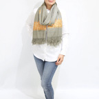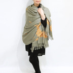192cm×102cm大判ショールサイズで、巻きでも羽織でもどちらも使いやすいストールです。特に羽織は全面に施された刺繍が美しく輝き、サッとあしらうだけでゴージャスな雰囲気に変化します。横幅が特に長いのでドレスや着物などの羽織物としても重宝します。