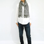 スタンダードな大判サイズで、首に巻くことはもちろん、室内でのひざ掛けにも、肩から羽織る使い方もできます。特に羽織りは、パッと華やかにエレガントな雰囲気に変わります。上半身を覆えるので、着ている服を気にせず合わせることができます。忙しい朝もコーディネートを気にする必要はありません。