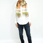 スタンダードな大判サイズで、首に巻くことはもちろん、室内でのひざ掛けにも、肩から羽織る使い方もできます。特に羽織りは、パッと華やかにエレガントな雰囲気に変わります。上半身を覆えるので、着ている服を気にせず合わせることができます。忙しい朝もコーディネートを気にする必要はありません。