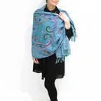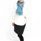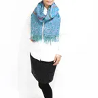 スタンダードな大判サイズで、首に巻くことはもちろん、室内でのひざ掛けにも、肩から羽織る使い方もできます。特に羽織りは、パッと華やかにエレガントな雰囲気に変わります。上半身を覆えるので、着ている服を気にせず合わせることができます。忙しい朝もコーディネートを気にする必要はありません。
