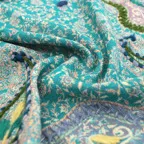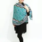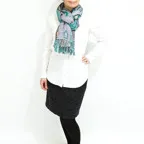 スタンダードな大判サイズで、首に巻くことはもちろん、室内でのひざ掛けにも、肩から羽織る使い方もできます。特に羽織りは、パッと華やかにエレガントな雰囲気に変わります。上半身を覆えるので、着ている服を気にせず合わせることができます。忙しい朝もコーディネートを気にする必要はありません。
