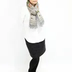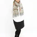 スタンダードな大判サイズで、首に巻くことはもちろん、室内でのひざ掛けにも、肩から羽織る使い方もできます。特に羽織りは、パッと華やかにエレガントな雰囲気に変わります。上半身を覆えるので、着ている服を気にせず合わせることができます。忙しい朝もコーディネートを気にする必要はありません。