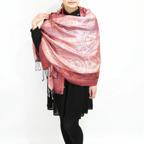 スタンダートな大判サイズで巻いても羽織っても、どちらも使いやすいタイプです。特に羽織は全体の印象がパッと華やかに、エレガントな雰囲気に変化します。